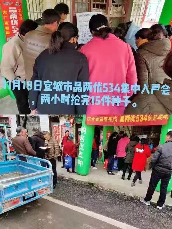 11月18日,宜城市晶兩優534集中入戶會,兩小時搶完15件種子。