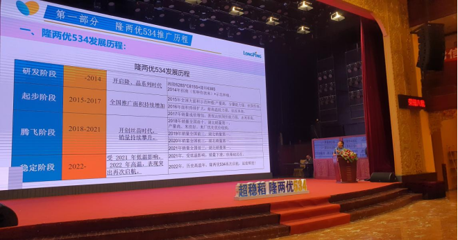 隨后,會議由隆平種業總經理助理、隆平品牌負責人黃年豐帶來以隆兩優534推廣歷程為核心的《榮耀八載黃金十年、開創種業絲苗時代》分享。報告從隆兩優534推廣歷程、共同成長以及展望未來三個方面闡釋了隆兩優534從起步到輝煌的發展歷程,同時指出立足當下,憑借超穩的品種表現、強勢的活動力度、嚴格市場管控,定能再創隆兩優534輝煌,迎接下一個黃金十年,助力隆平下一代超級大單品的打造。