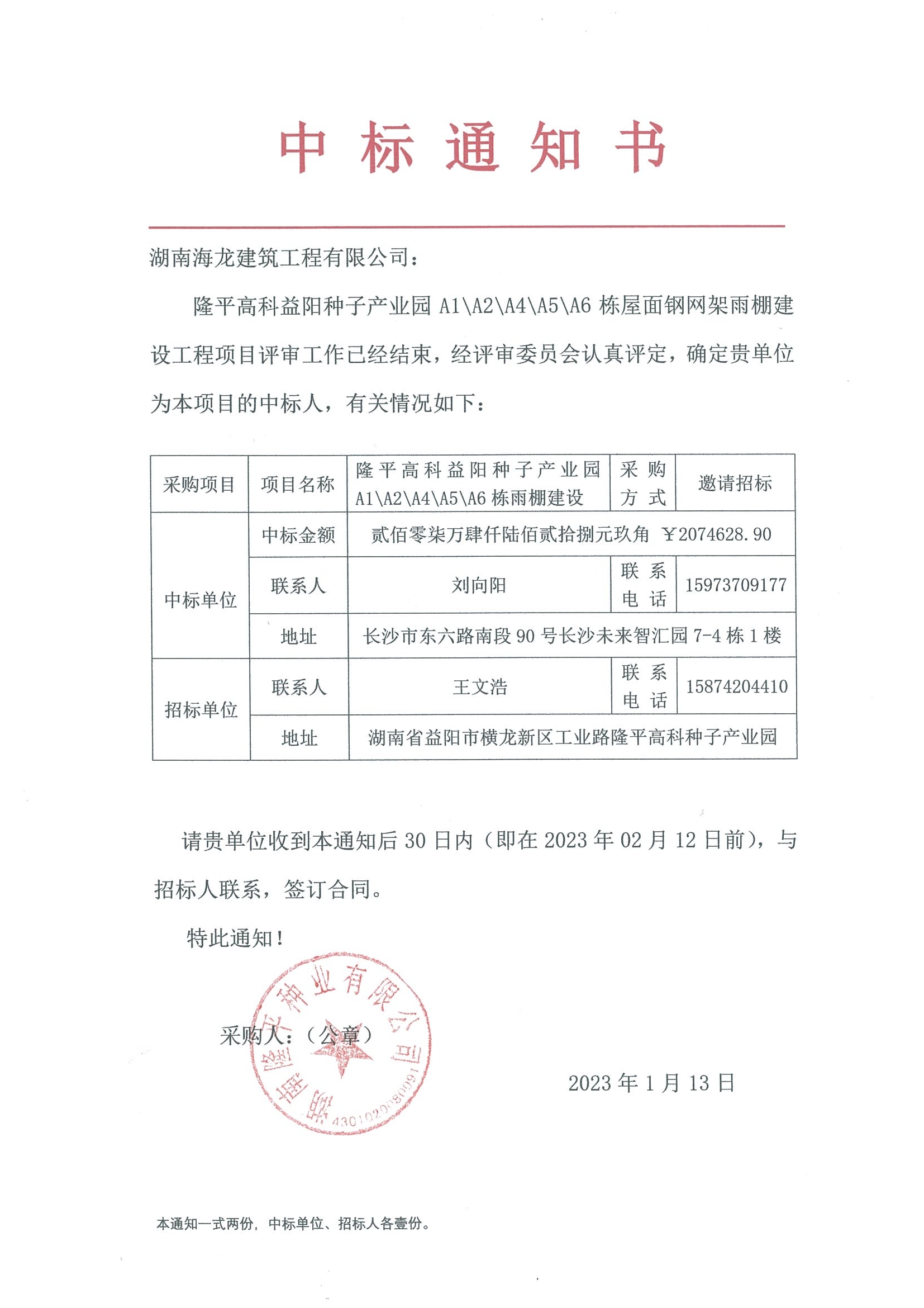 隆平高科益陽種子產業園A1/A2/A4/A5/A6棟屋面鋼網架雨棚建設工程項目招標評審會2023年1月5日10:00時于益陽種子產業園召開了開、評標會議。經評審,現將中標相關信息予以公示。