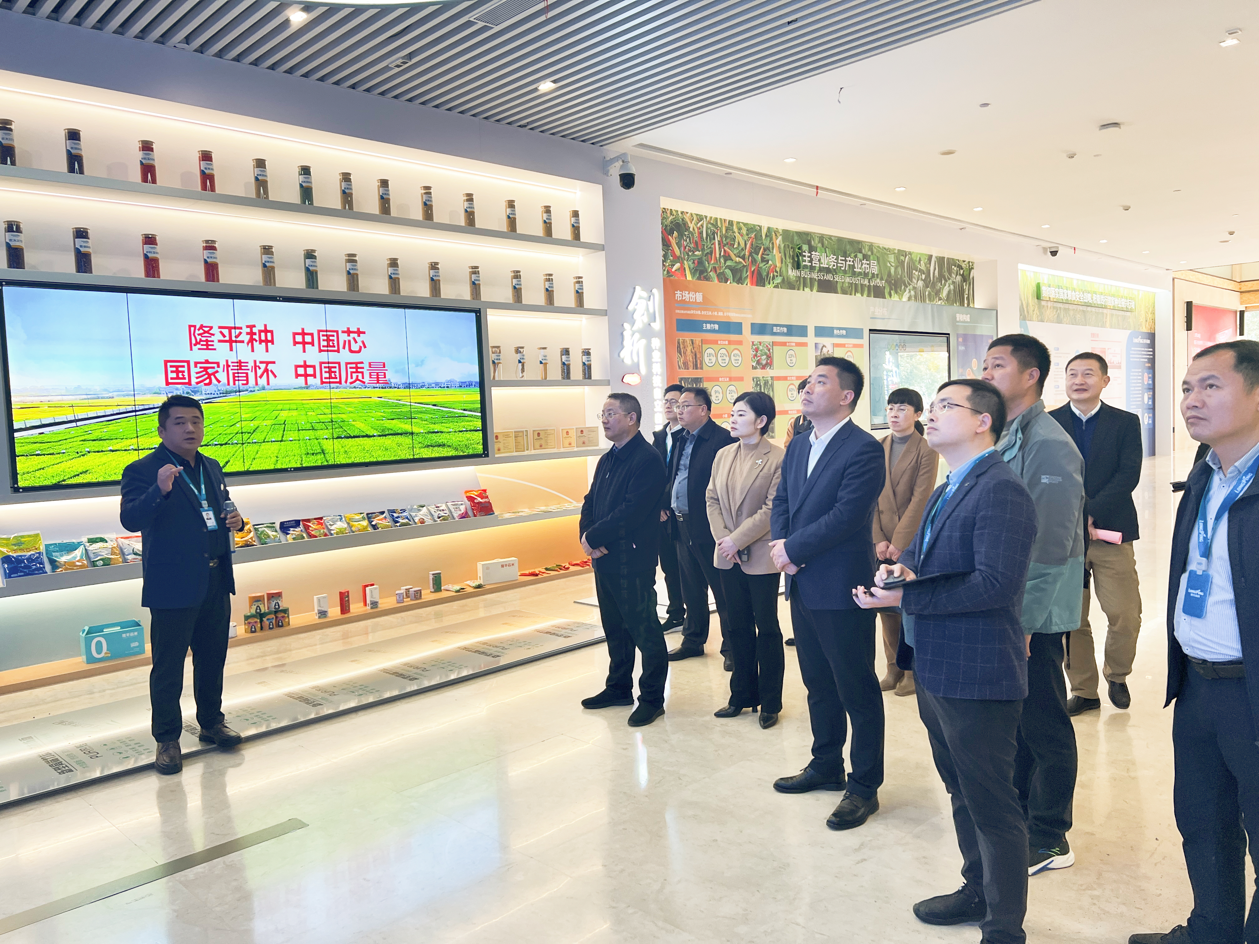 尹賢文副總裁和盧成林總經理對胡銘主任一行蒞臨公司調研表示熱烈歡迎,并邀請胡銘主任一行參觀了隆平高科展廳,胡銘主任對公司在種業領域做出的貢獻,以及在數字化管理體系和信息化建設方面表示高度肯定。