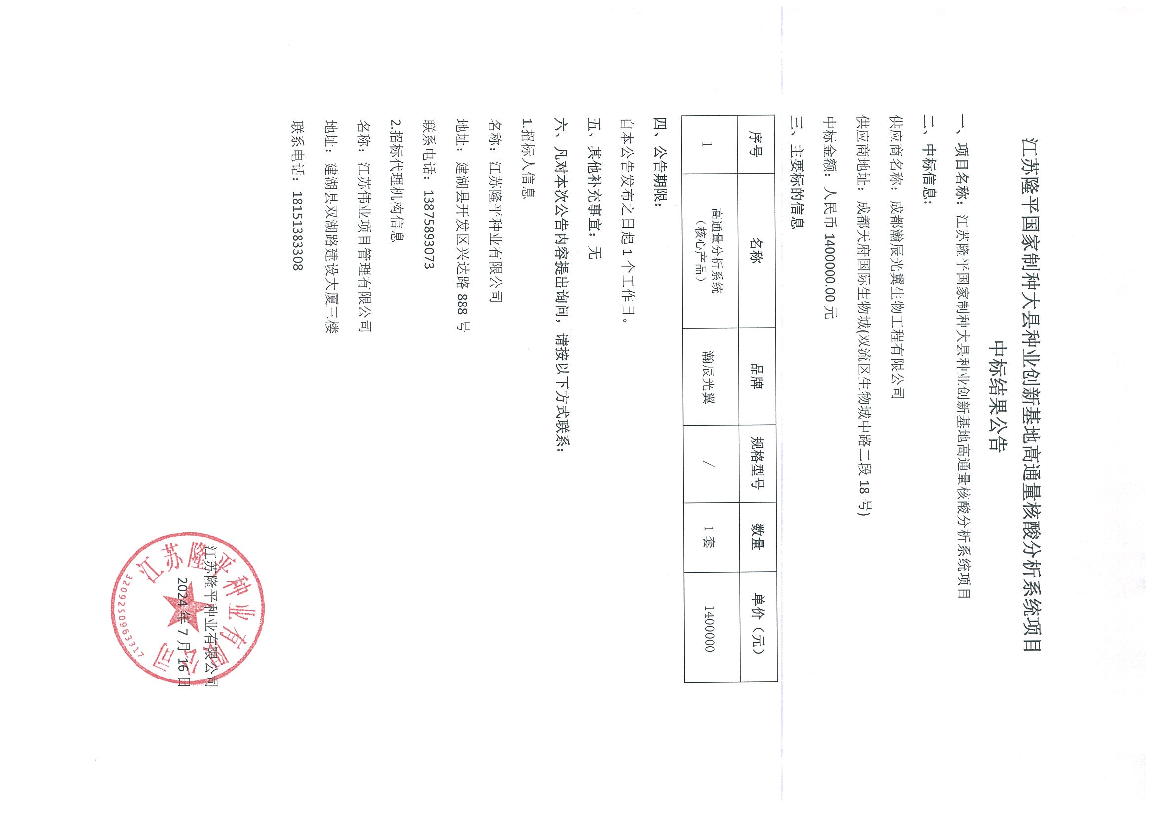 江蘇隆平國家制種大縣種業(yè)創(chuàng)新基地高通量核酸分析系統(tǒng)項目中標結(jié)果公告