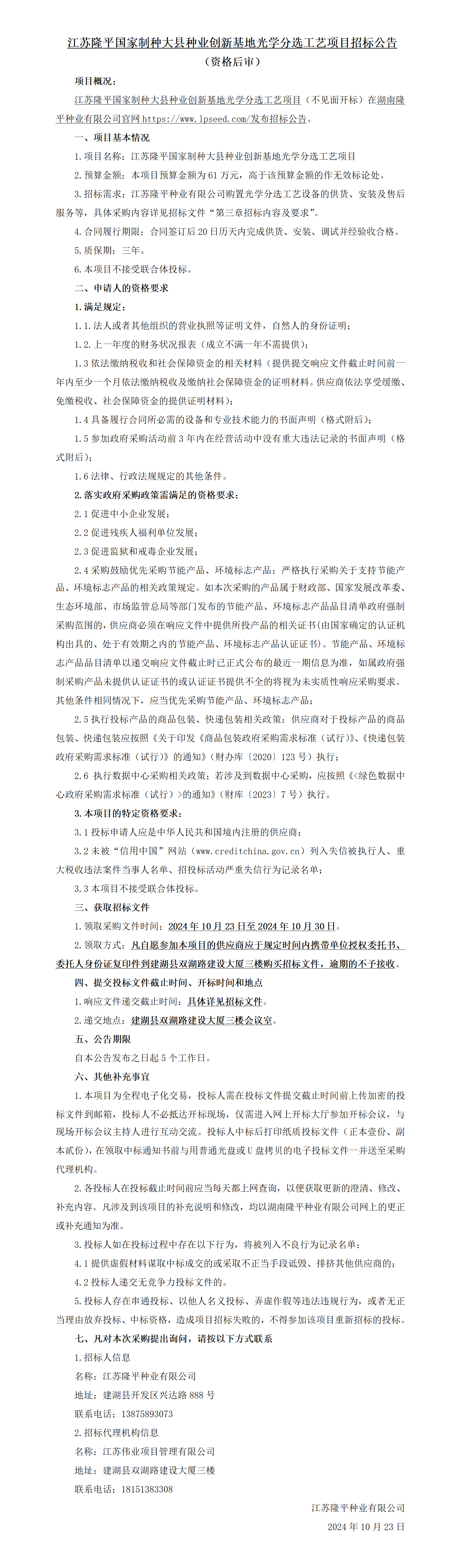 江蘇隆平國家制種大縣種業創新基地光學分選工藝項目招標公告