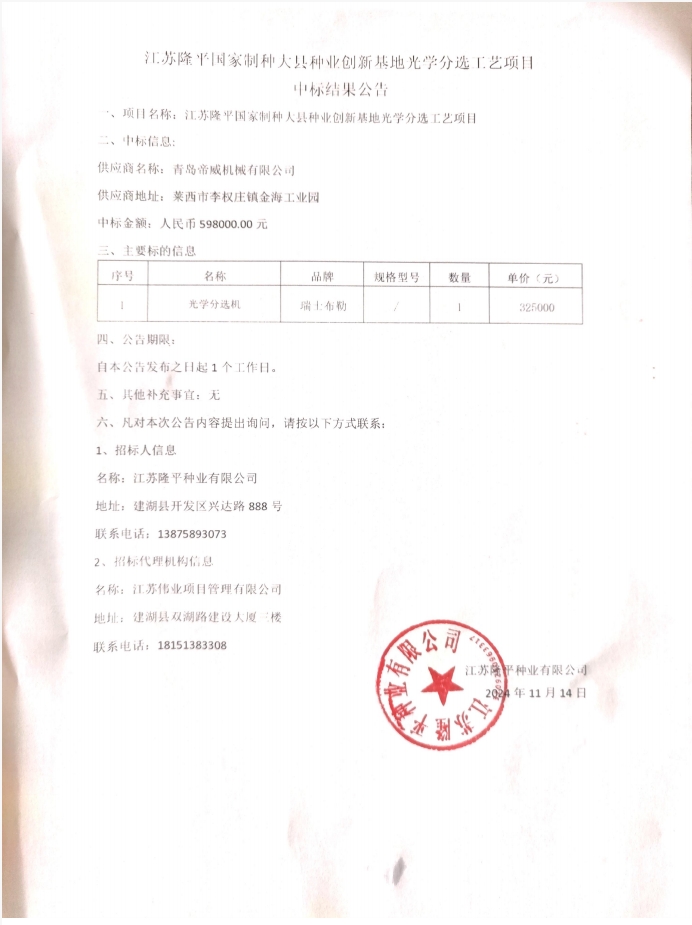 江蘇隆平國(guó)家制種大縣種業(yè)創(chuàng)新基地光學(xué)分選工藝項(xiàng)目中標(biāo)結(jié)果公告