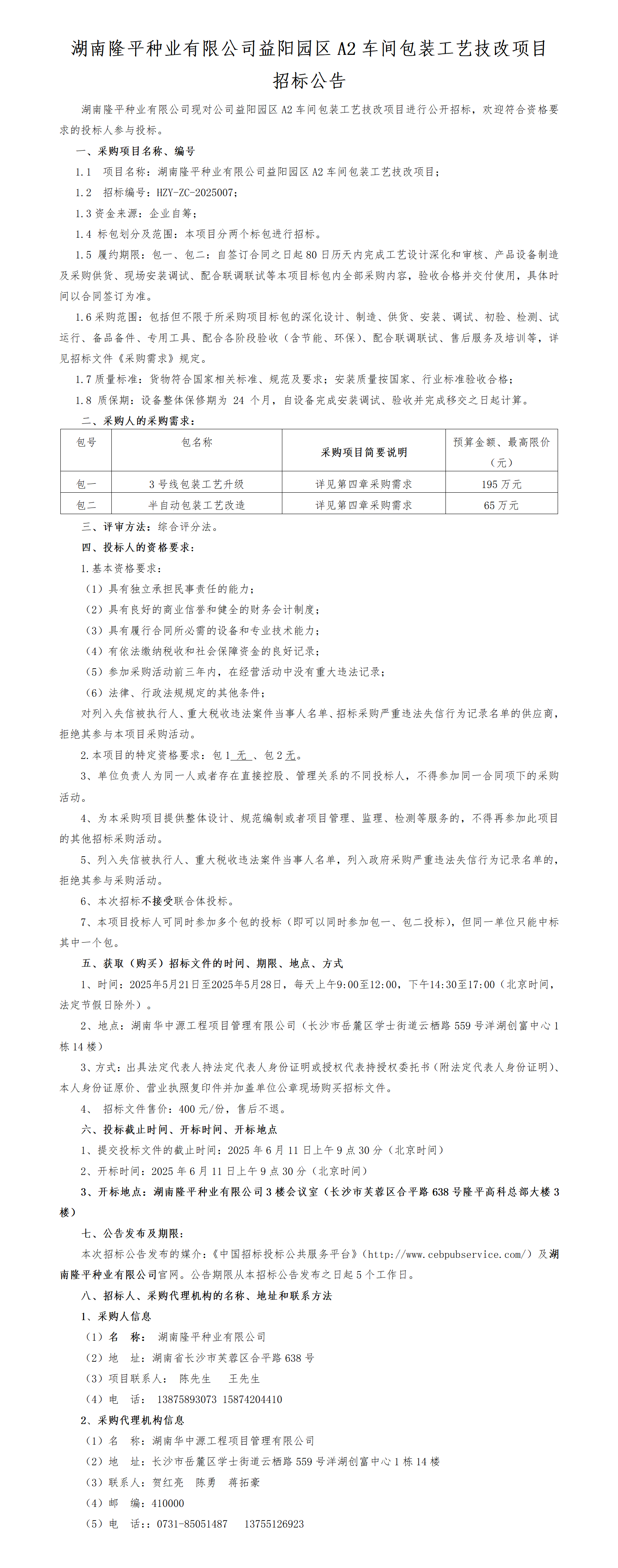 湖南隆平種業(yè)有限公司益陽園區(qū)A2車間包裝工藝技改項(xiàng)目招標(biāo)公告