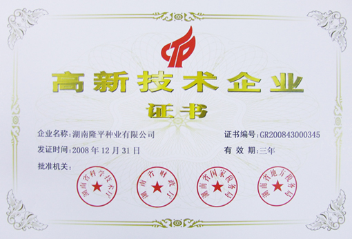 (上圖為獲獎牌匾和證書。) 根據(jù)《高新技術(shù)企業(yè)認(rèn)定管理辦法》(國科發(fā)辦[2008]172 號)和《高新技術(shù)企業(yè)認(rèn)定管理工作指引》(國科發(fā)火[2008]362 號)有關(guān)規(guī)定,經(jīng)企業(yè)申報、地方初審、專家審查、公示等程序,我公司于近日收到湖南省科學(xué)技術(shù)廳、湖南省財政廳、湖南省國家稅務(wù)局、湖南省地方稅務(wù)局于2009年2 月16日聯(lián)合發(fā)布的《關(guān)于認(rèn)定三一重工股份有限公司等318家企業(yè)為湖南省2008年第二批高新技術(shù)企業(yè)的通知》(湘科字[2009]20號),認(rèn)定湖南隆平種業(yè)有限公司為湖南省2008 年第二批高新技術(shù)企業(yè),證書編號:GR200843000345;認(rèn)定有效期3 年。 |