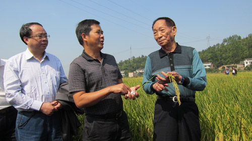 10月15日,秋高氣爽,袁隆平院士蒞臨衡東縣新塘鎮公司準兩優608超級稻百畝示范驗收片考察,國家雜交水稻研究中心副主任馬國輝、衡陽市政協主席王雄飛及各級農業主管領導陪同,公司總經理廖翠猛、常務副總龍和平現場介紹示范片種植情況與品種表現。