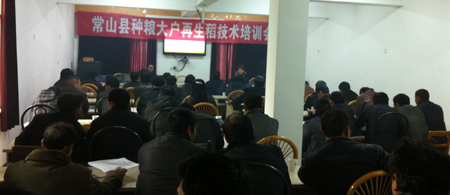 首先,常山縣農辦副主任洪小峰做了糧油生產培訓開班講話,農業局副局長黃道龍強調今年要把再生稻生產作為常山縣糧食生產的重點和亮點來抓,爭取通過再生稻這個突破口使常山縣糧食科技和產量上一個新臺階,勉勵種糧大戶要聽好課,掌握好科學技術,糧食種出水平。