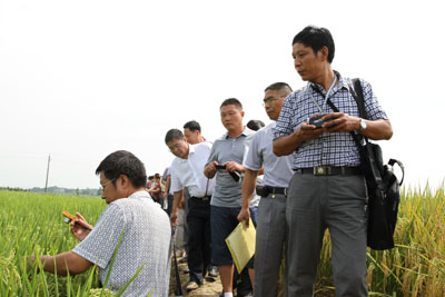 田間觀摩會(huì)議在寧鄉(xiāng)關(guān)山基地和雙鳧鋪鎮(zhèn)召開(kāi)。到示范基地的時(shí)候已是正午時(shí)分,看到品種的田間表現(xiàn),與會(huì)代理商非常興奮,不畏酷暑,移步在田間,處處是相機(jī)拍照的咔咔聲、贊嘆聲。他們或是俯身仔細(xì)查看稻穗,或是直接進(jìn)入田中親自感受,對(duì)隆平種業(yè)豐富的品種資源和部分后繼品種優(yōu)異的表現(xiàn)發(fā)出由衷的贊嘆。在關(guān)山基地進(jìn)行實(shí)地觀摩了解之后,大家都有了更強(qiáng)的信心,紛紛表示一定會(huì)努力推廣隆平的好品種。會(huì)后,營(yíng)銷三部分別與各代理商溝通,簽訂意向銷售協(xié)議,為接下來(lái)的的銷售工作打下了堅(jiān)實(shí)的基礎(chǔ)。