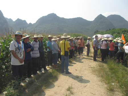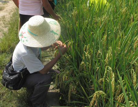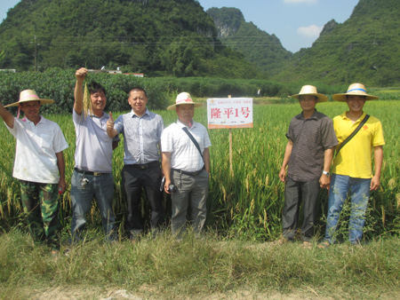 秋高氣爽,沉甸甸的稻穗迎風(fēng)擺動(dòng)。廣西崇左市天等縣于9月18日上午在龍茗鎮(zhèn)那乙屯召開(kāi)了隆平1號(hào)示范觀摩會(huì)。來(lái)自天等縣各鄉(xiāng)鎮(zhèn)的零售商、種田大戶及那乙屯農(nóng)戶86人前來(lái)觀摩。示范田邊,有的忙著數(shù)穗粒數(shù),有的忙著照相,有的忙著探討栽培技術(shù),個(gè)個(gè)贊不絕口。