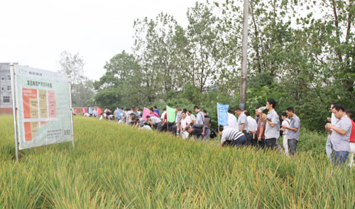 會議分為田間觀摩和室內交流兩個部分。田間觀摩在公司位于寧鄉關山的新品種展示基地進行,金秋九月,示范田的稻子葉青籽黃,飽滿、低垂的稻穗在陣陣清風中搖曳生姿。代理商們現場觀摩了1000多個正在田間展示的品種長勢情況,在技術服務部鐘其全經理的講解下,代理商們重點觀摩了民生種業主推的第四期超級稻品種深兩優1813和1892S/R1813、新安S/R1813、深08S/R841等重點品種,這些品種正處在即將成熟收割的階段,莖干挺拔、穗大粒多,田間表現非常優秀!大家走到深兩優1813田邊時,鐘其全經理介紹此品種是袁老師心目中的超級稻中的美人胚:完美的株葉形態,掃帚般的穗子,矮壯的莖稈著實惹人喜愛。代理商們都紛紛駐足,和“美人“合影留戀。