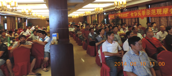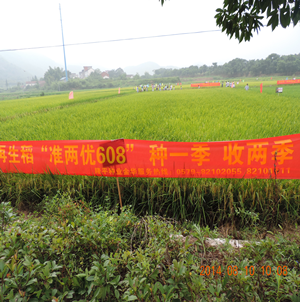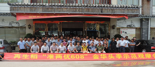 2014年8月10日上午,浙江金華市成功召開了準兩優608再生稻頭季觀摩會。一大清早,來自金華市所有縣市級、紹興諸暨市的大戶及金華市、義烏市農業局的部分領導來到義烏市佛堂鎮雞毛換糖大酒店,近150人統一坐大巴出發來到種田大戶朱國富田間進行了田間觀摩。
