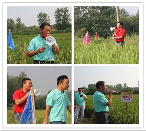 30日早上八點半,車隊準時到達室外會場,李總和張站長在田間為客戶介紹Y兩優896百畝示范片的栽培管理水平及特征特性。