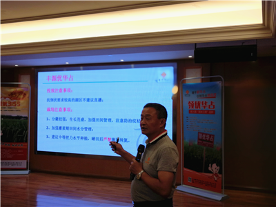 接著,水稻技術指導專家廖老師深入講解了隆平品牌重點品種栽培注意事項及病蟲防治要求。廖老師深入淺出地分析了廣西近年來水稻的病害情況,詳細介紹了領優華占,隆優3155,韻兩優332等隆平品牌新品種,并對廣西區域水稻的主要病蟲防治提出寶貴建議。